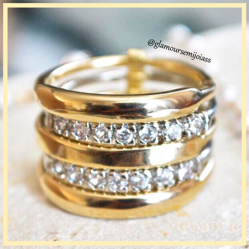 O Anel 5 Aros esbanja Glamour, Folheado em Ouro 18k, Cravejado com zircônias brancas.